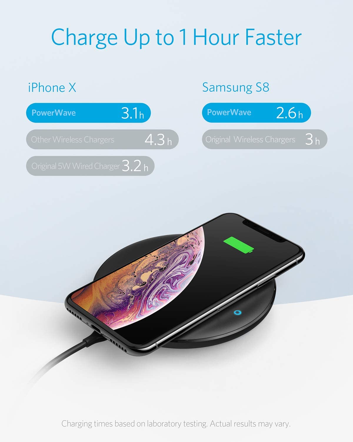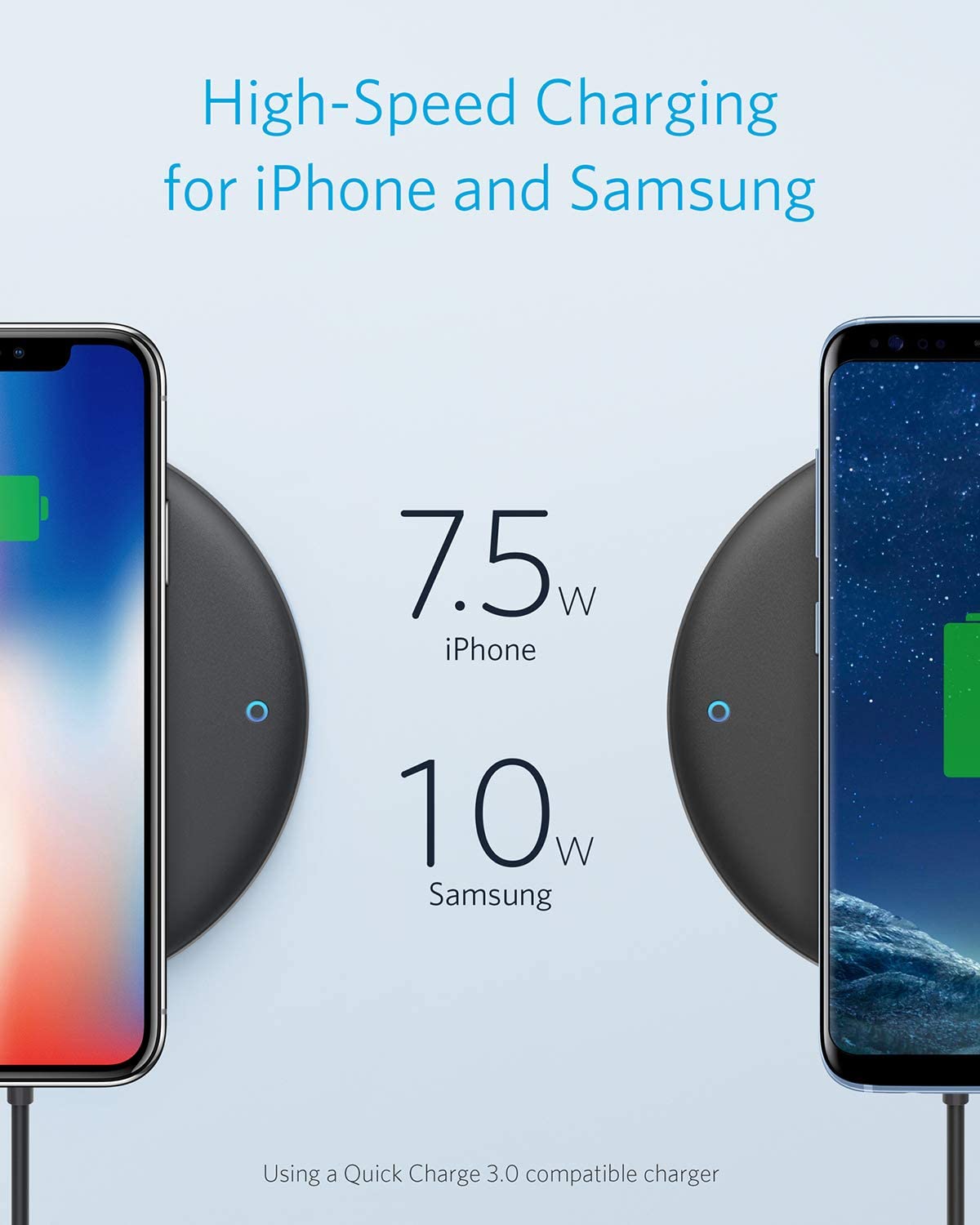 One for All: works with all wirelessly-charged phones, including the latest iPhone (7. 5W) and Samsung flagship phones (10W). quick Charge 3. 0 wall charger (included) required.