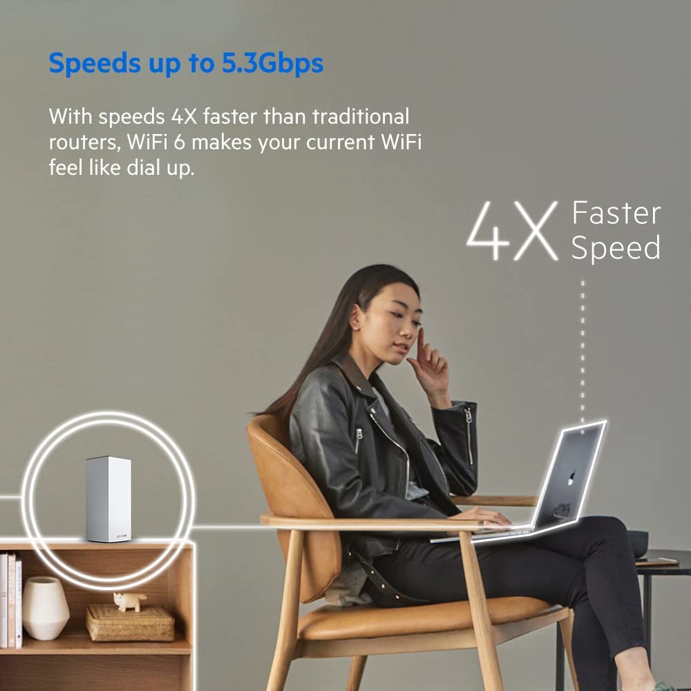 Offering exceptional speed, coverage, and capacity, the Linksys MX5300 Velop Whole Home Mesh WiFi 6 (AX) System is the next generation of WiFi. This Mesh WiFi system combines Velop's Intelligent Mesh technology with WiFi 6 to deliver true gigabit WiFi speeds, up to 5.3 Gbps to every corner of your home, including outdoor areas. Capable of sending and receiving multiple streams of data simultaneously, WiFi 6 (AX) has four times the capacity of WiFi 5 (AC) technology. The Velop WiFi 6 Tri-Band series can handle 50+ devices, so laptops, televisions, smart-home systems, and more can all operate simultaneously with ease. Featuring BSS technology, this Mesh Wifi system minimises congestion by eliminating interference from nearby wireless networks in order to deliver a strong, clear wireless signal to your home. The MX5300 is part of Velop's modular system, which means increasing your coverage is as simple as adding another node. And with the Linksys App, setting up your system is fast and easy, so you can enjoy the next evolution of WiFi in a matter of minutes.