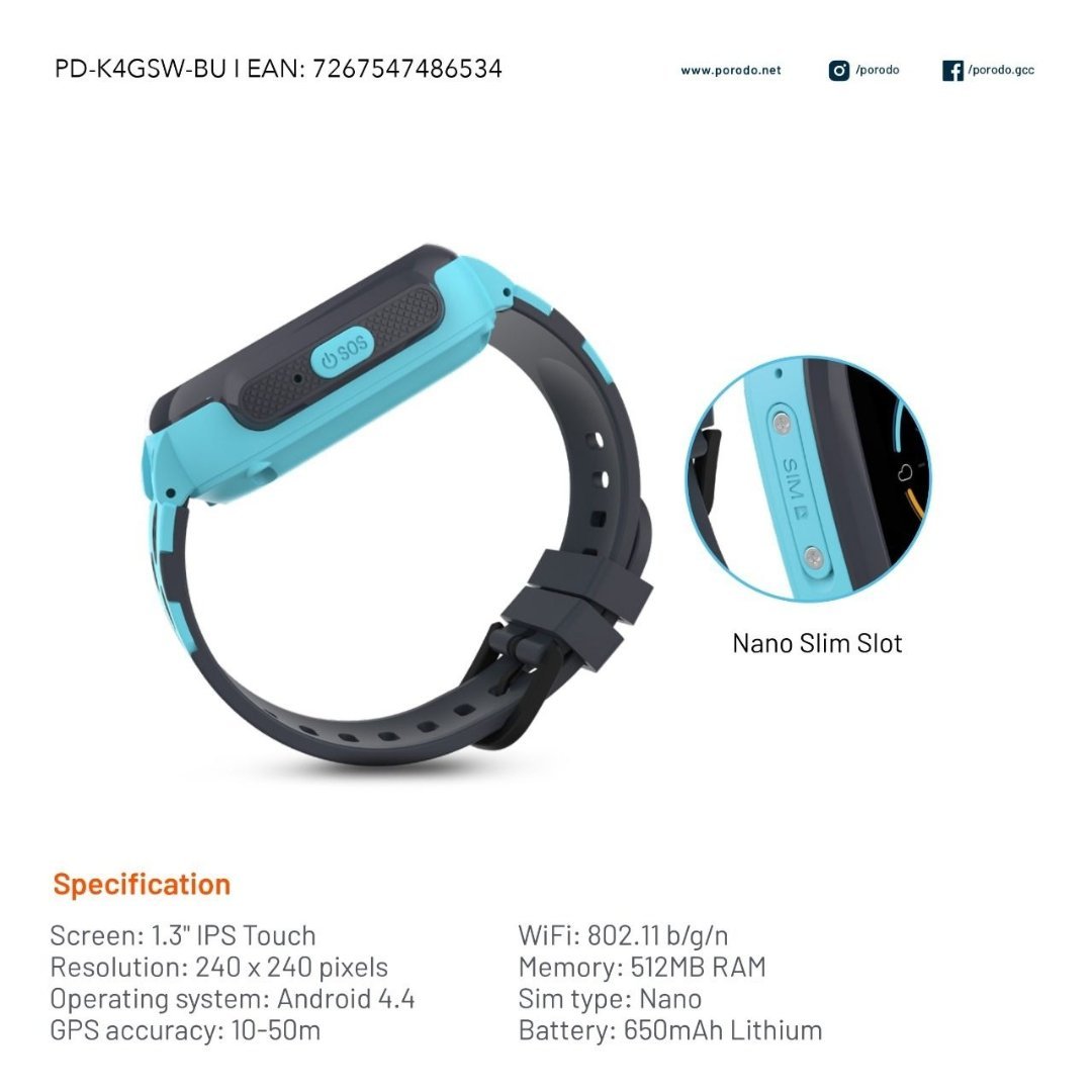 Today smart watches have become a great way to display your smartphones' notifications and track your health measures right from your wrist. Here, Porodo has introduced an innovative smartwatch exclusively designed for Kids. It can help to track your children and their health activities while away from you. This smartwatch is equipped with a dedicated sim card slot and video calling support. Using the built-in SOS feature, the children can send alerts to the parents in case of any emergency outside of the home. If you insert a nano sim card in this watch, you can make audio and video calls with your children. Beyond exclusive calling features, the watch will allow you to track the kids' fitness. This kid's smartwatch can count the steps, record the heart rate, and measure the body temperature. Using the “CarePro+” application, compatible with both android and iOS, you can get all updates to your mobile, and you will be able to take essential follow-ups on your kids. This smartwatch for kids 4G Nano sim card is very helpful for video calling. Moreover, this kid's smartwatch is safe and secure for kids as it is a built-in lightweight material with IP65 water resistance features. This kid's smartwatch will provide your children with a premium wearable experience with classic looks. Porodo Kids 4G Smartwatch with video calling is an intelligent companion to secure your children while they are away from you. This kid's smartwatch can also be used as a GPS tracker for your children, which will help you know their real-time location. The smartwatch comes with a 750 mAh battery which can be active for up to 48 hours. Note: An IP65 rated enclosure gives protection against low pressure water jets from any direction, as well as condensation and water spray.