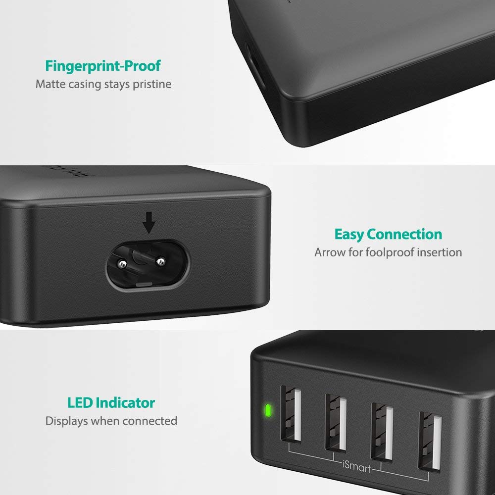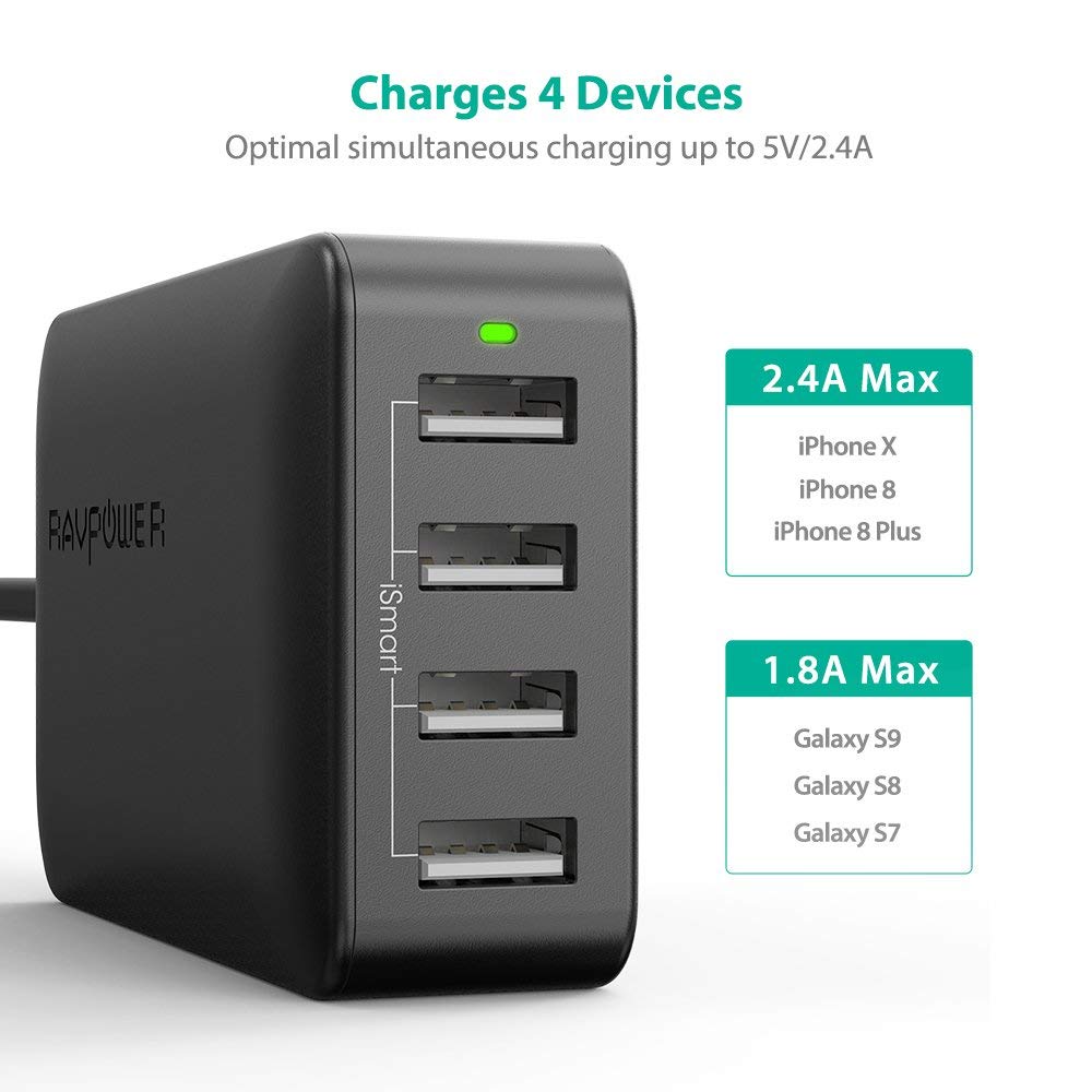 Charges 4 devices: 4 USB ports speedily charge your smartphone, iPad, headphones or power bank up to 5V/8a total (2.4a Max each)